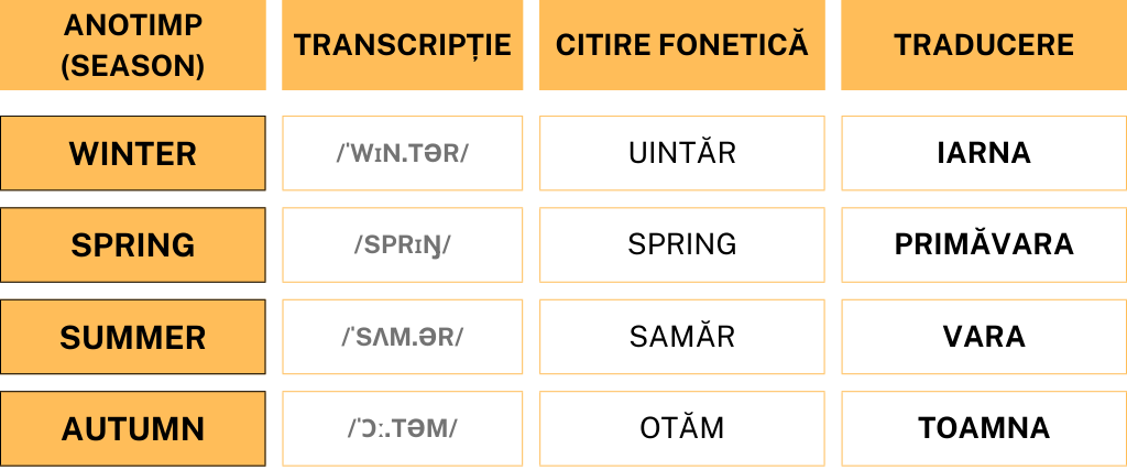 ❗ Cuvânul "anotimp" în engleză se traduce drept season /ˈsiː.zən/.