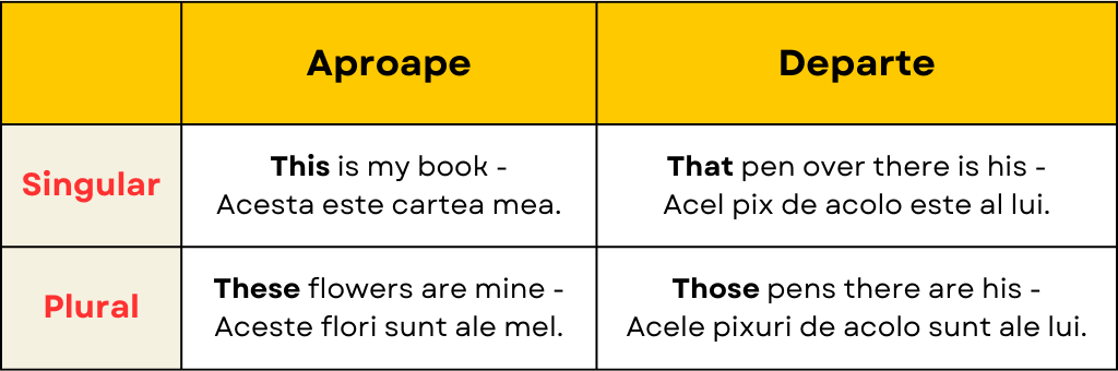 Cele patru pronume demonstrative engleze sunt this, that, these, and those. Acestea sunt folosite pentru a evidenția ceva care a fost menționat anterior sau care este clar din context. Pronumele demonstrative în engleză atrag atenția asupra obiectului sau persoanei la care te referi.