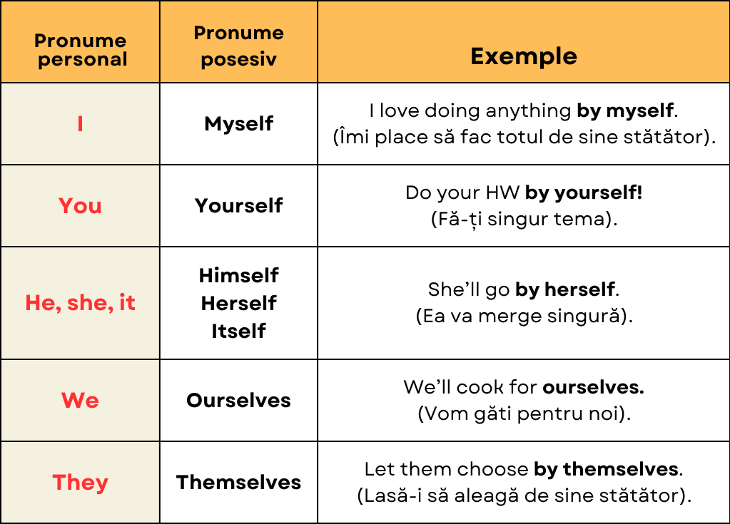 Pronumele reflexive sunt cuvinte ce se referă la o persoană sau la un lucru. Folosim adesea pronumele reflexive atunci când subiectul și obiectul unui verb sunt același. Pronumele reflexive în engleză sunt: myself, yourself, himself, herself, itself, ourselves, themselves.