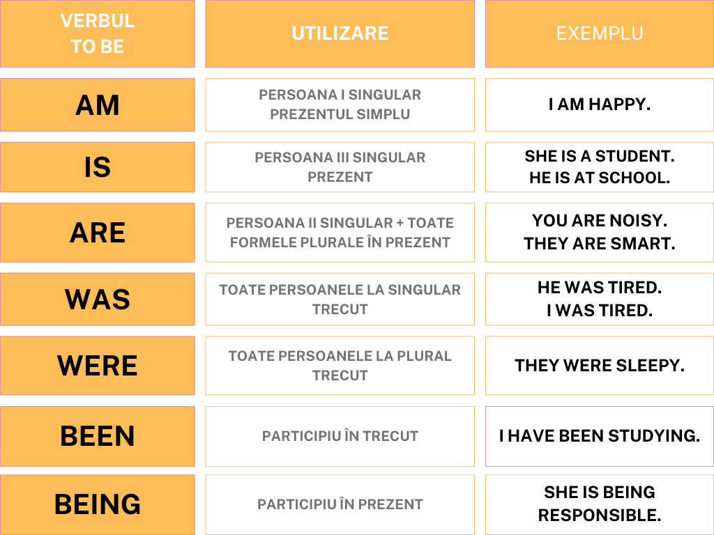 Mai jos, găsești tabelul cu toate formele verbului “to be”, când se folosesc acestea și exemple. Recomandăm să parcurgi toate timpurile în engleză, pentru a putea face diferență dintre acestea și a înțelege când și cum se utilizează corect.